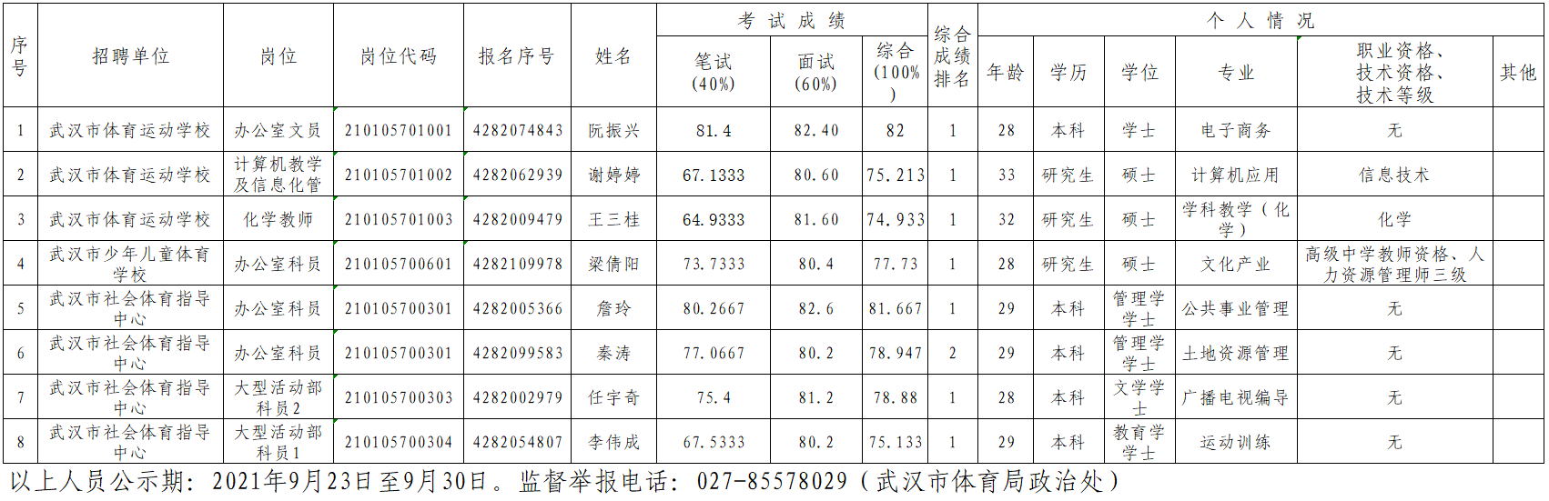2021年武汉市事业单位公开招聘拟聘用人员公示表
