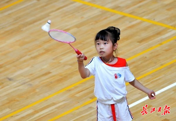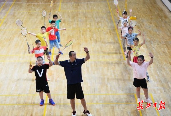 在武汉体育馆,学员在教练指导下学习羽毛球入门动作。