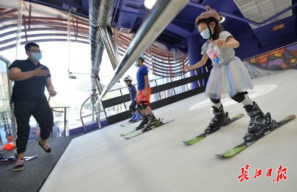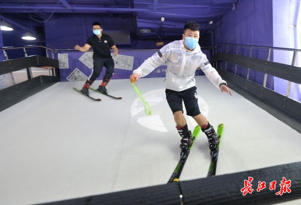 在硚口雪酷城市滑雪空间,教练在亲自示范滑雪。