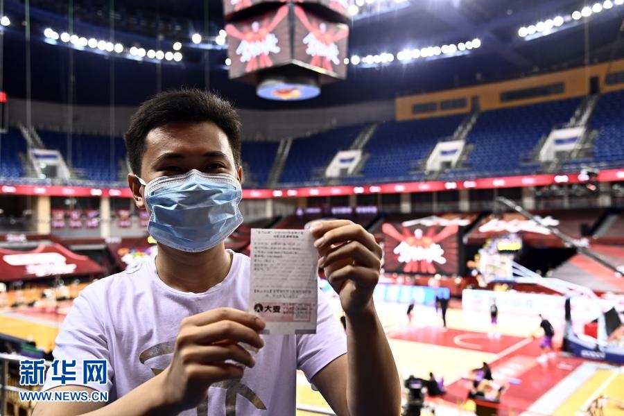 这是2020年7月26日,在青岛国信体育馆,苏柯帆展示着自己的纸质球票。他成为2019-2020赛季CBA联赛复赛允许观众现场观赛后,首位进场的观众。新华社记者 郭绪雷 摄