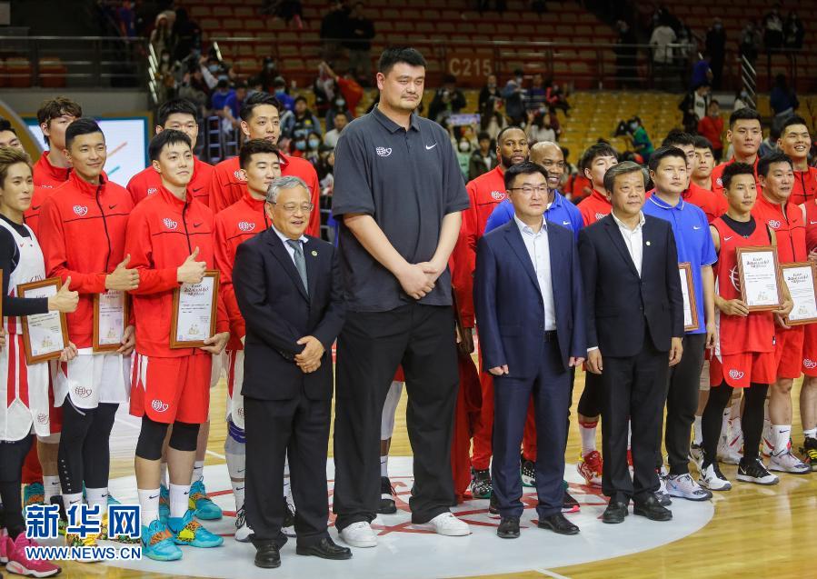 这是2020年10月4日,姚基金创始人姚明(中)在2020姚基金慈善赛后与嘉宾以及球员合影。新华社记者 肖艺九 摄