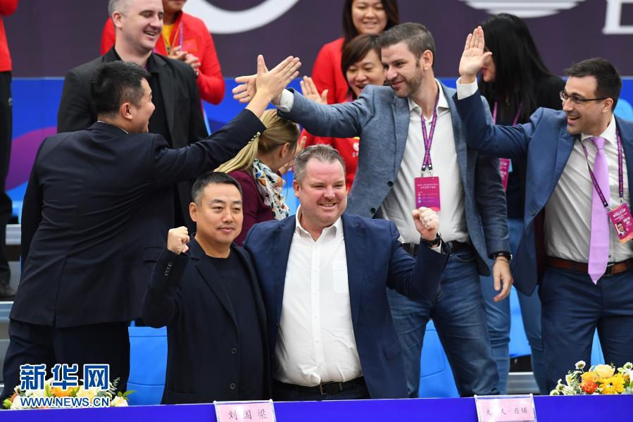 这是2020年11月8日,刘国梁(前排左)与国际乒联首席执行官丹顿(前排右)在山东威海庆祝2020国际乒联女子世界杯开幕。新华社记者 朱峥 摄