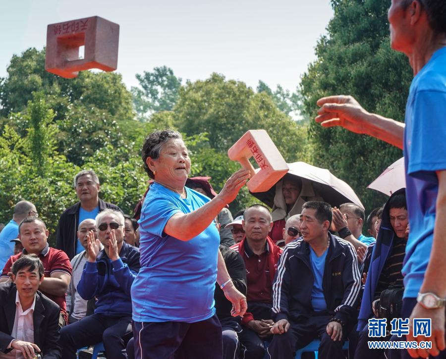 这是2019年5月11日,78岁的孙玉萍(前左)在南京体育嘉年华石锁表演赛上表演。新华社记者 杨磊 摄