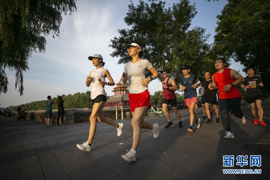 这是2020年8月8日,北京协和医院护士尤佳(左一)与“跑友”在北京故宫角楼附近晨跑。新华社记者 李明 摄