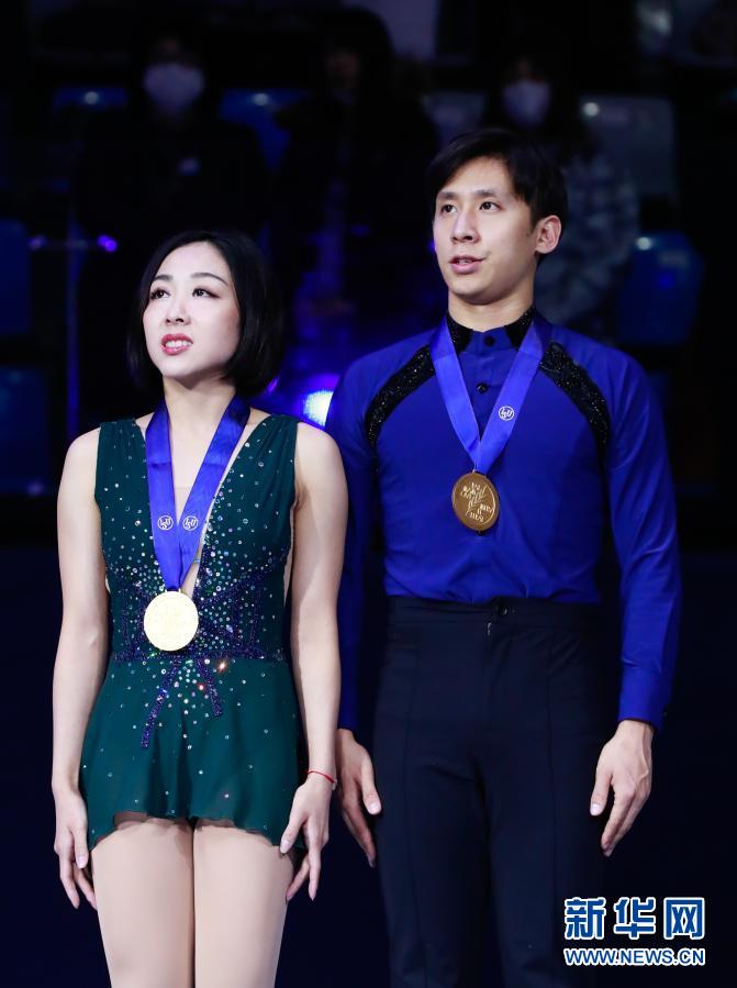 这是2020年2月8日,隋文静/韩聪(右)在花样滑冰四大洲锦标赛双人滑颁奖仪式上。新华社记者 王婧嫱 摄