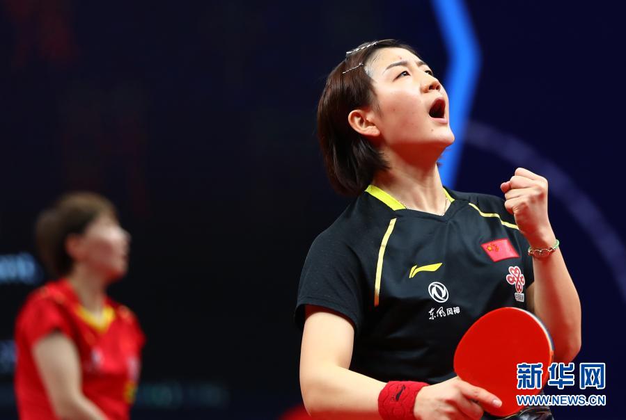 这是2020年11月22日,陈梦(右)在国际乒联总决赛女子单打决赛后庆祝夺冠。新华社记者 王东震 摄