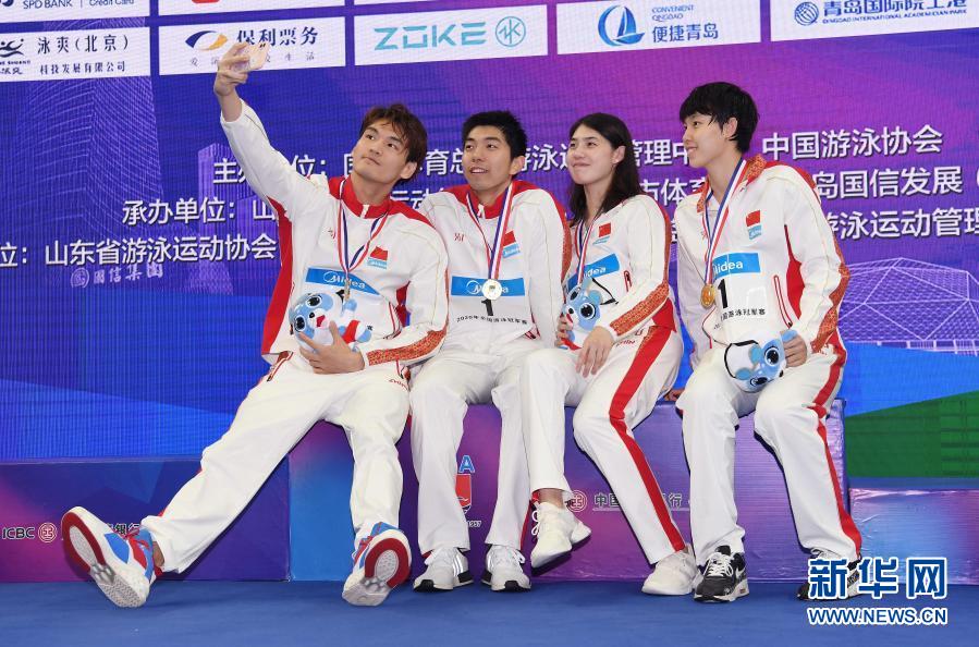 这是2020年10月2日,徐嘉余、闫子贝、张雨霏和杨浚瑄(从左至右)在全国游泳冠军赛暨东京奥运会达标赛男女4X100米混合泳接力颁奖仪式后自拍。新华社记者陶希夷摄