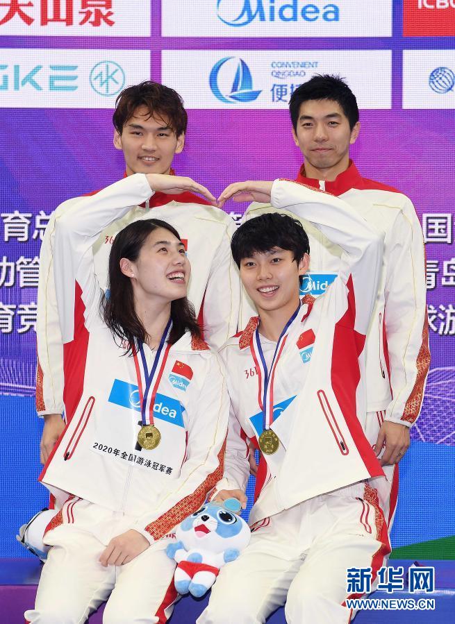 这是2020年10月2日,徐嘉余、闫子贝、张雨霏和杨浚瑄(从左至右)在全国游泳冠军赛暨东京奥运会达标赛男女4X100米混合泳接力决赛后合影。新华社记者陶希夷摄