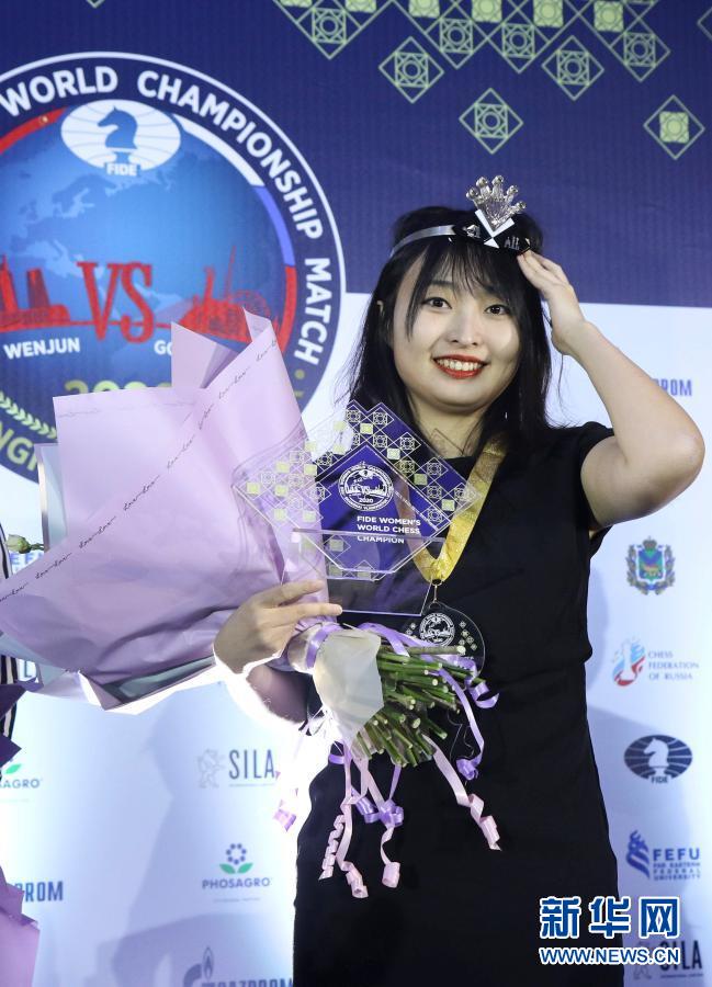 这是2020年1月24日,居文君在世界国际象棋女子锦标赛冠军对抗赛颁奖仪式上。新华社发(艾特里·库巴拉什维利摄)
