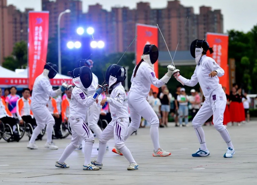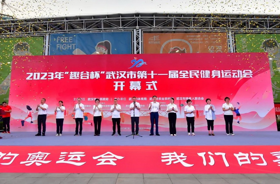 7月2日,在精彩纷呈的武术、击剑、轮椅国标和健身操舞表演中,2023年“趣谷杯”武汉市第十一届全民健身运动会在武汉全民健身中心正式开幕,来自市、区两级体育部门的代表和体育运动爱好者共300余人,通过参与赛事、运动体验的形式同享“身边的奥运会”“我们的嘉年华””。