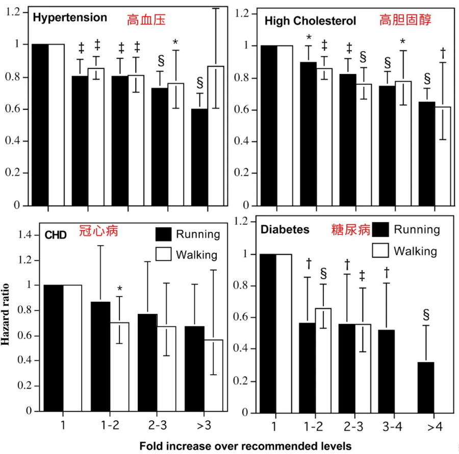 但更令人出乎意料的是:当二者同等能量消耗时,走路在降低高血压和高胆固醇血症风险上略高于跑步,走路带来的健康益处反而超越了跑步!