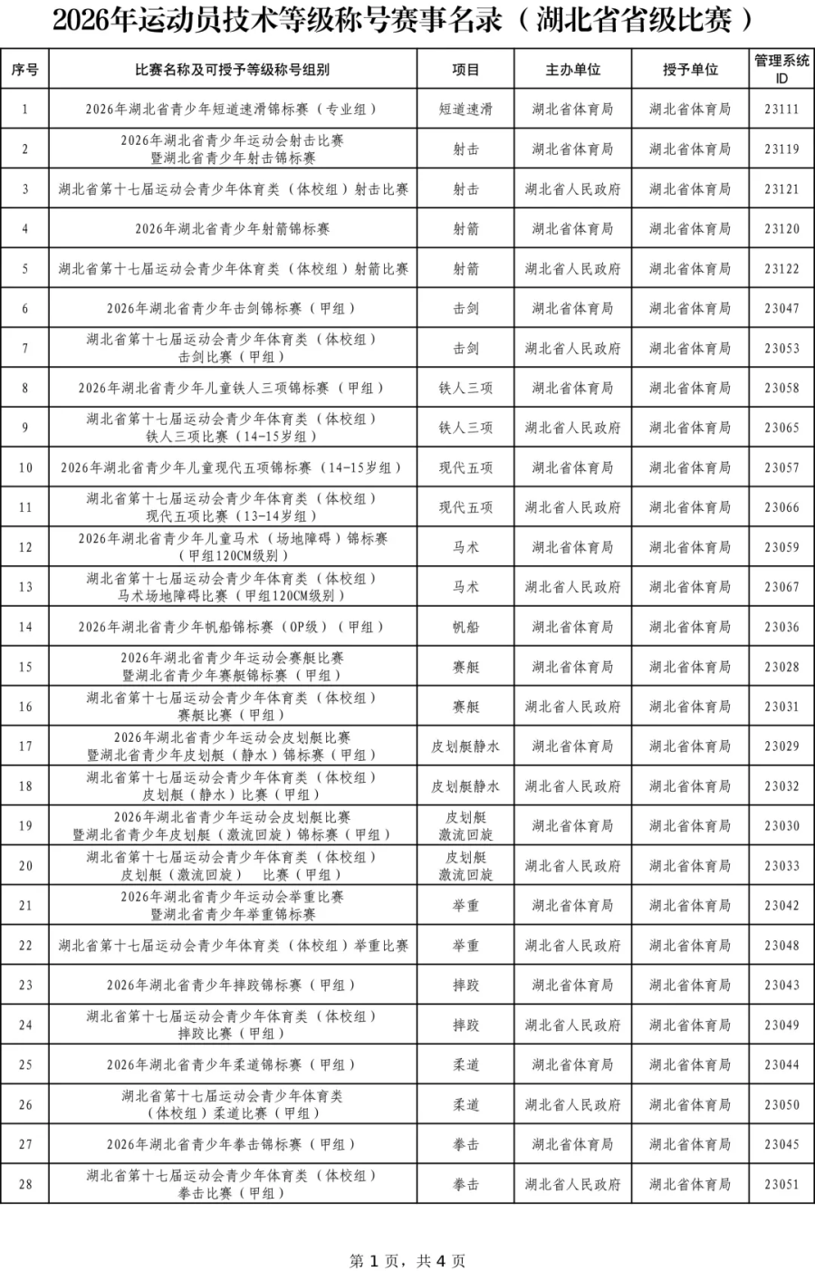 根据《体育总局办公厅关于公布2026年运动员技术等级称号赛事名录的通知》(体竞字〔2025〕173号)要求,为规范运动员技术等级管理工作,加大公开力度,现将2026年省级比赛运动员技术等级称号赛事名录予以公布。有关要求如下: