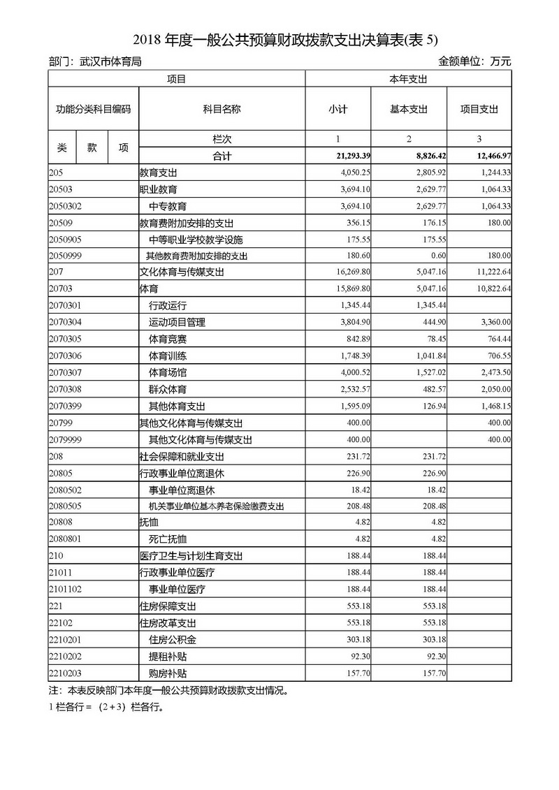 2018年一般公共预算财政拨款支出年初预算为22,784.27万元,支出决算为21,293.39万元,完成年初预算的93.50%。其中:基本支出8,826.42万元,项目支出12,466.97 万元。项目支出主要用于全民健身550万元,主要成效进一步推动全民健身“便民惠民”,引导市民积极参与全民健身活动;青少年业训专项75万元,主要成效加强青少年体育工作,广泛开展青少年体育活动;训练参赛费3,305.76万元,主要成效加快我市竞技体育发展,积极参加全国城市运动会和为湖北省和国家培养、输送优秀青少年体育后备人才;基建维修改造2,962.96万元,主要成效广泛开展体育活动,统筹和完善体育活动场地设施;体育产业试点城市发展工作经费100万元,主要成效加快体育健身休闲业、竞赛表演业、场馆服务业、中介和商贸服务业等发展等。
