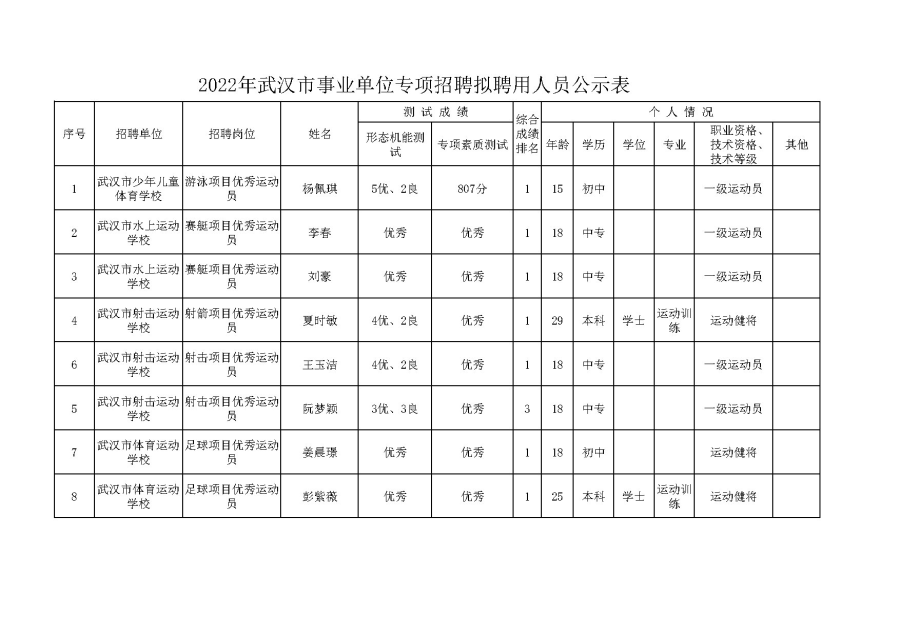 2022年武汉市事业单位专项招聘拟聘用人员公示表