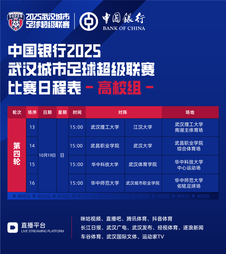 【官方发布】中国银行2025武汉城市足球超级联赛(高校组)第四轮比赛日程表