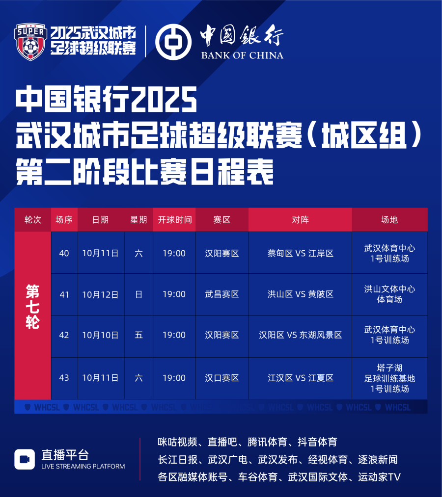 【官方发布】中国银行2025武汉城市足球超级联赛(城区组)第七轮比赛日程表