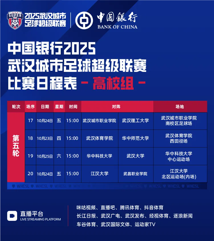 【官方发布】中国银行2025武汉城市足球超级联赛(高校组)第五轮比赛日程表