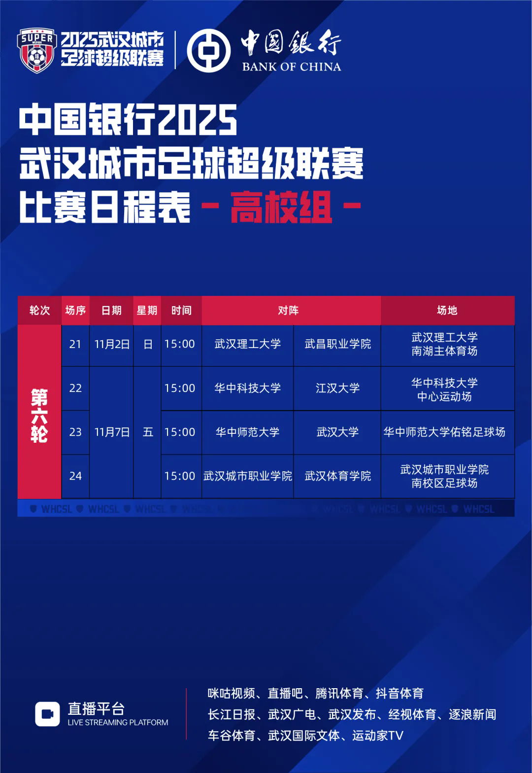 【官方发布】中国银行2025武汉城市足球超级联赛(高校组)第六轮比赛日程表