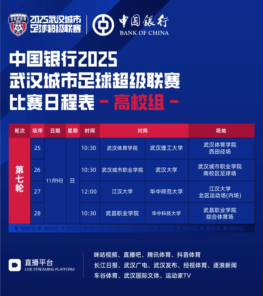 【官方发布】中国银行2025武汉城市足球超级联赛(高校组)第七轮比赛日程表